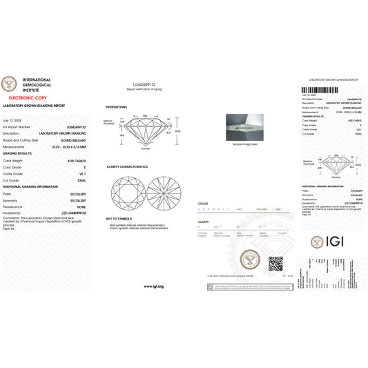 4.0 Carat Round Lab Grown Diamond Super Ideal Cut - E Color - VS1 Clarity -IGI Certified