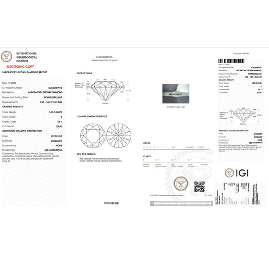 3.0 Carat Round Lab Grown Diamond Super Ideal Cut - E Color - VS1 Clarity -IGI Certified