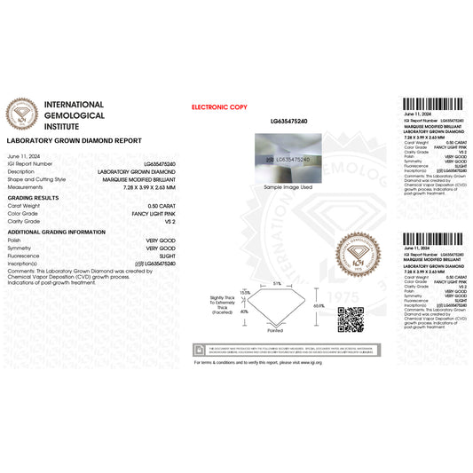 IGI Certified Lab Marquise Diamonds - Fancy Light Pink - Lab Grown Diamond 0.5ct